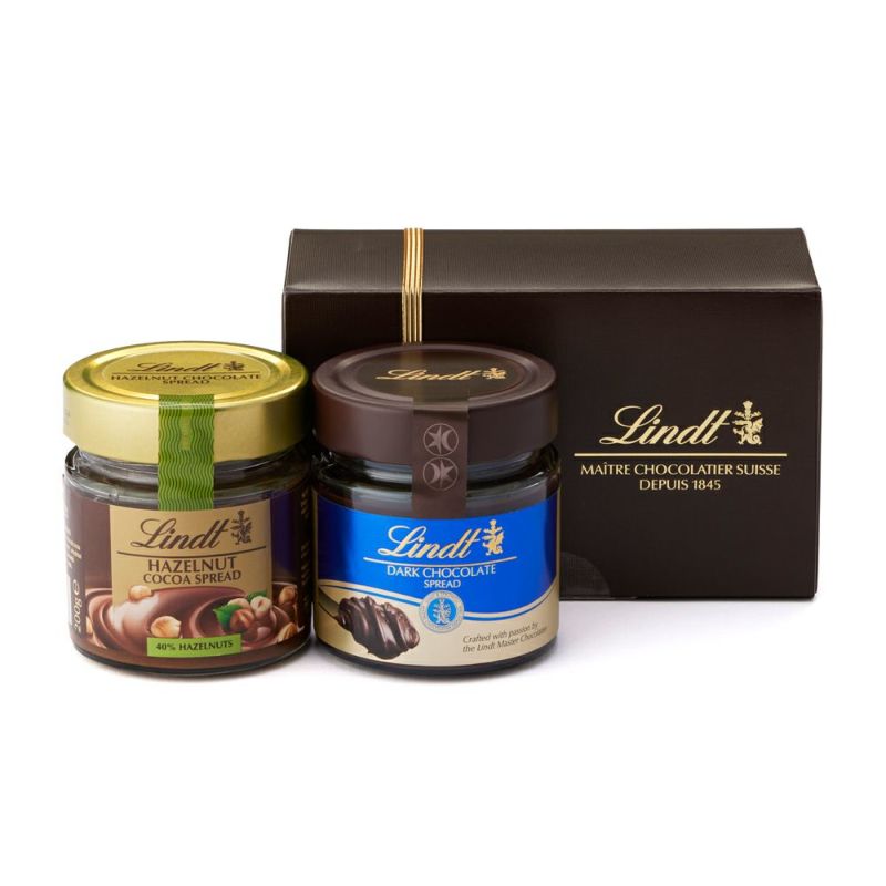 リンツのスプレッドを2種類詰め合わせたギフトセット。ヘーゼルナッツを40%も使った贅沢なスプレッドと、ダークで濃厚なチョコレートスプレッドをお楽しみいただけます。
