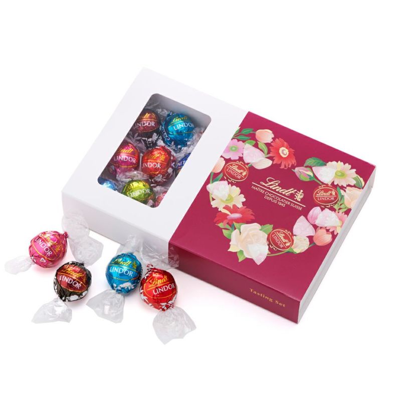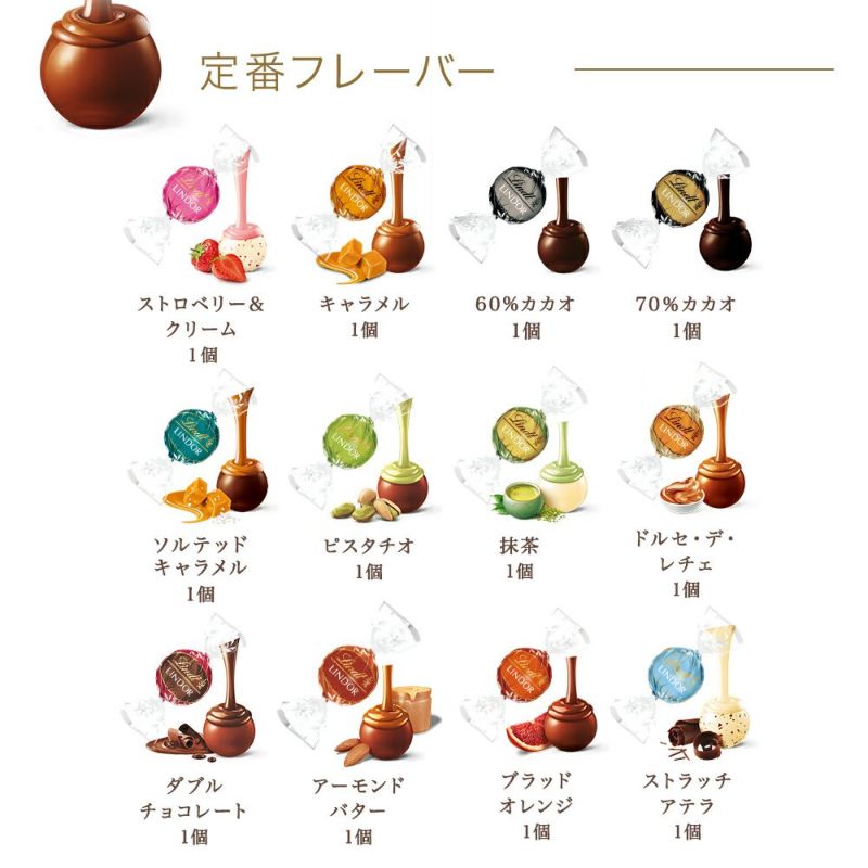 リンドール(バレンタイン2個、ダークストロベリー2個、ミルク1個、 ホワイト1個、ダーク1個、ヘーゼルナッツ1個、ブラッドオレンジ1個、70%カカオ1個、60%カカオ1個、ストロベリー&クリーム1個、ピスタチオ1個、キャラメル1個、ソルテッドキャラメル1個、ファッジスワール1個、ストラッチアテラ1個、抹茶1個、ドルセ・デ・レチェ1個、ダブルチョコレート1個)