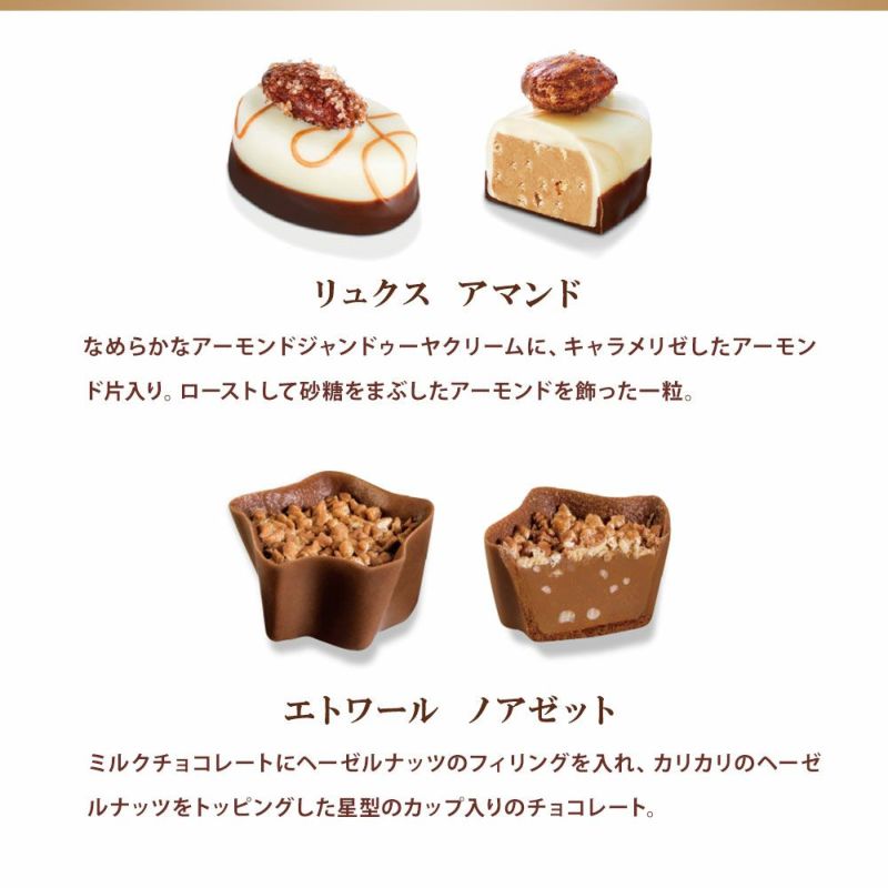 ・エトワール ノアゼット:ミルクチョコレートにヘーゼルナッツのフィリングを入れ、カリカリのヘーゼルナッツをトッピングした星形のカップ入りチョコレート。