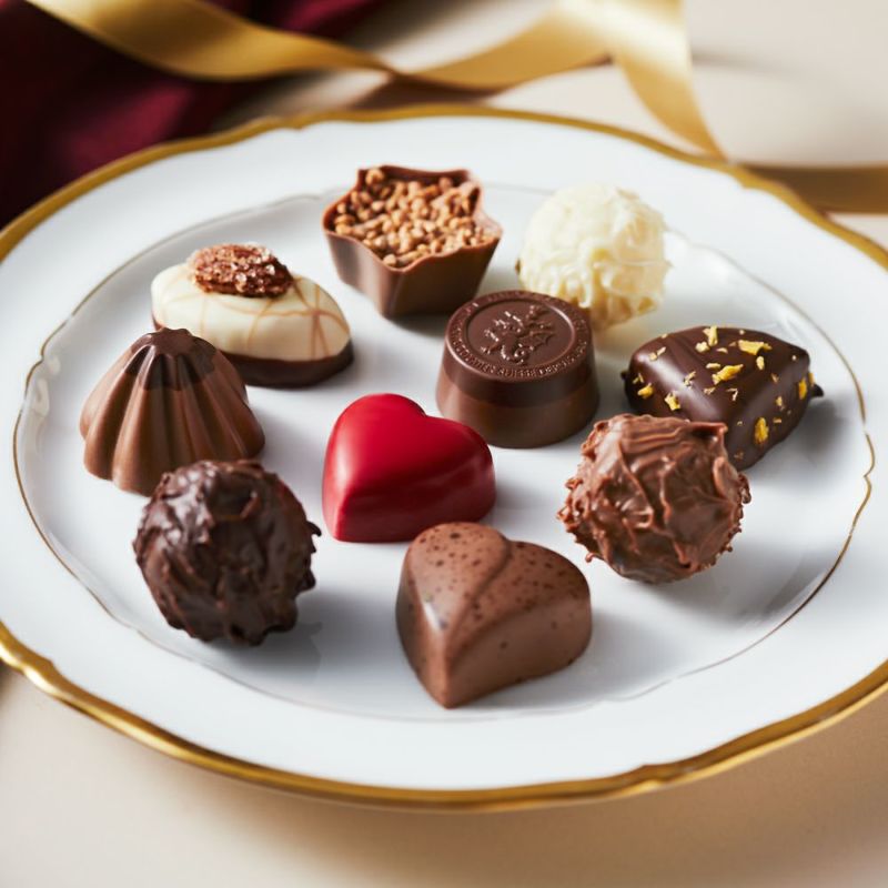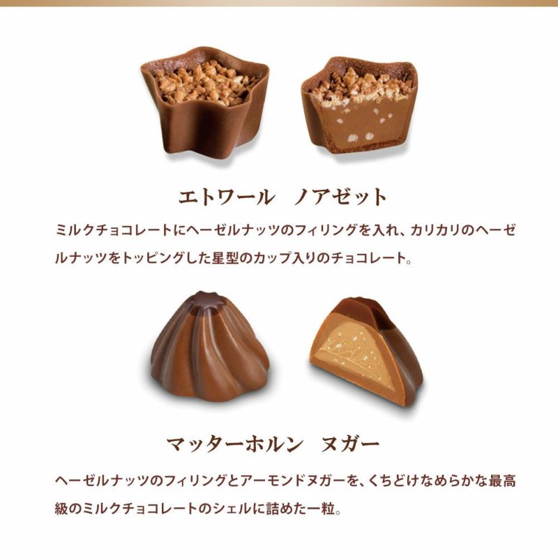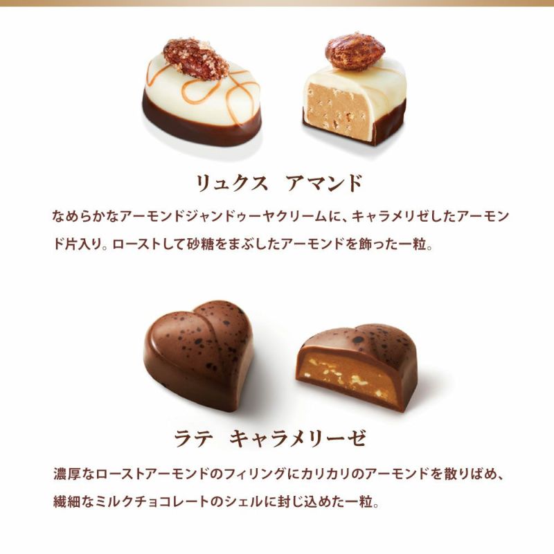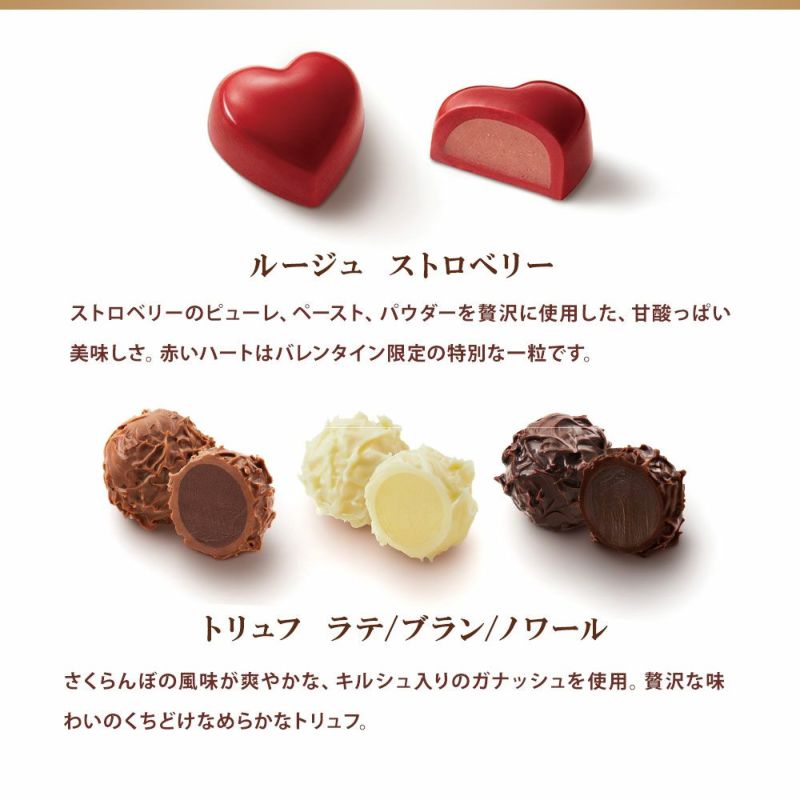 【内容】ルージュ ストロベリー 、トリュフ ラテ 各2個 トリュフ ブラン、トリュフ ノワール、ドラゴン クロッカン、リュクス アマンド、エトワール ノアゼット、トレゾール オランジュ、ラテ キャラメリーゼ、マッターホルン ヌガー 各1個