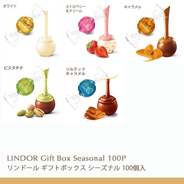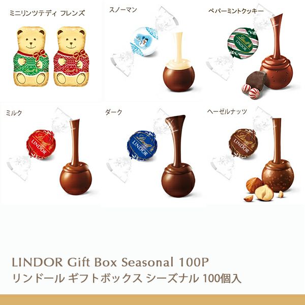 内容量 ミニリンツテディ フレンズ10g 9個、リンドール(スノーマン 9個、ペパーミントクッキー 9個、ミルク 10個、ダーク 9個、ヘーゼルナッツ 9個、ホワイト 9個、ストロベリー&クリーム 9個、キャラメル 9個、ピスタチオ 9個、ソルテッドキャラメル 9個)