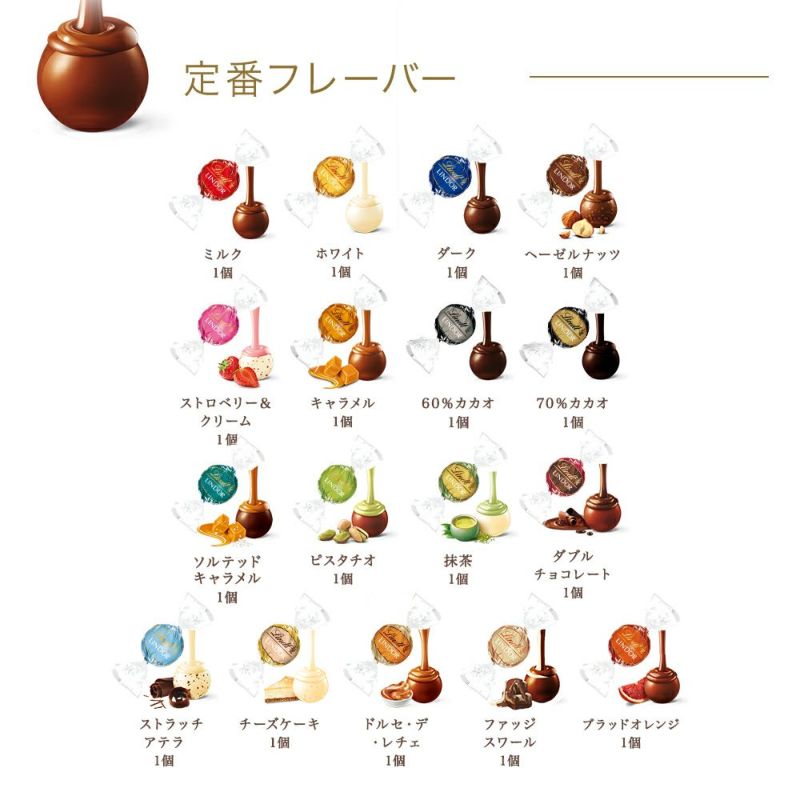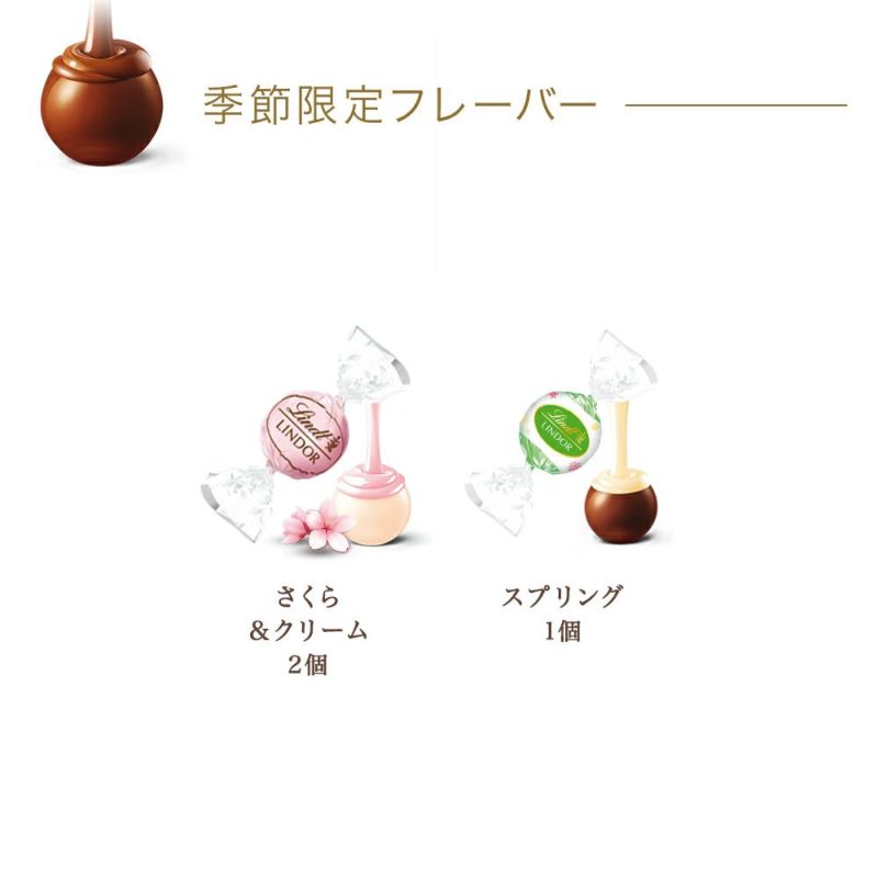 【内容】リンドール(さくら&クリーム2個、スプリング1個、ミルク1個、ダーク1個、ヘーゼルナッツ1個、ホワイト1個、ストロベリー&クリーム1個、70%カカオ1個、60%カカオ1個、キャラメル1個、ファッジスワール1個、抹茶1個、ストラッチアテラ1個、ピスタチオ1個、ドルセデレチェ1個、ソルテッドキャラメル1個、ダブルチョコレート1個ブラッドオレンジ1個、チーズケーキ1個)