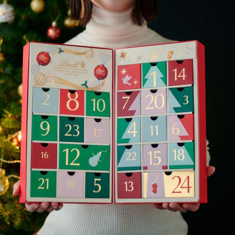"クリスマスが待ち遠しくなる、煌びやかな赤いパッケージにリンドールを入れたアドベントカレンダー。