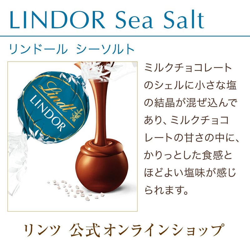 海の色を思わせるコバルトブルーの包みのリンドールシーソルト。ミルクチョコレートにちりばめられた塩の結晶のほのかなしょっぱさと食感がお楽しみいただけます。