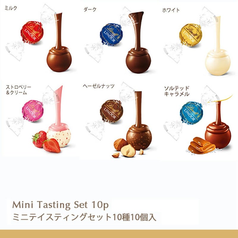 【内容】リンドール(ミルク、 ホワイト、ダーク、ヘーゼルナッツ、ストロベリー&クリーム、70%カカオ、ピスタチオ、ソルテッドキャラメル、ダブルチョコレート、チーズケーキ 各1個)