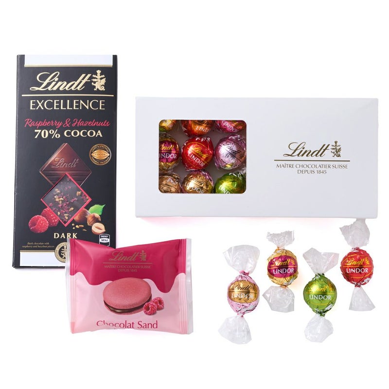 月替わりのチョコレートにも、70%カカオもビターなタブレットにカリカリとした食感のロースト・ヘーゼルナッツとフリーズドライのラズベリーをトッピングした「エクセレンス ラズベリー&ヘーゼルナッツ 70% カカオ」と、香ばしく焼き上げたサブレから、はみ出すほど贅沢にチョコレートを使用した「リンツ ショコラサンド フランボワーズ 」の2つのフルーティな味わいをセレクト。
