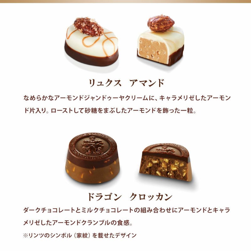 なめらかなアーモンド ジャンドゥーヤクリームにキャラメリゼしたアーモンド片を合わせた「リュクス アマンド」や、リンツの家紋を載せたスペシャルデザインの「ドラゴン クロッカン」などに、日本独自開発の甘酸っぱいストロベリー味のハート形状の「ルージュ ストロベリー」を加えた全6種類のフレーバーラインアップ。