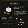 ・ミルクココナッツ プラリネ:キャラメリゼしたココナッツ片入りのアーモンドプラリネフィリングをミルクチョコレートでコーティング。クセのないすっきりとしたココナッツ風味。