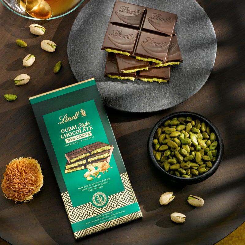 リンツのドバイスタイル チョコレートに「70%カカオ ダーク」が新登場!なめらかなリンツ70%カカオダークチョコレートに、上質なピスタチオペーストと香ばしいカダイフを贅沢に詰め込みました。