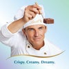 ミルク:ココアウエハースの層と、ホイップされたミルクチョコレートクリームの層が重なりあい、なめらかなミルクチョコレートでコーティングされたひと粒