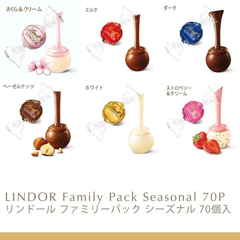 【内容】リンドール(さくら&クリーム 4個、ミルク 7個、ダーク 7個、ヘーゼルナッツ 7個、ホワイト 7個、ストロベリー 7個、キャラメル 7個、抹茶 7個、ピスタチオ 7個、ダブルチョコレート 6個、ブラッドオレンジ 4個)