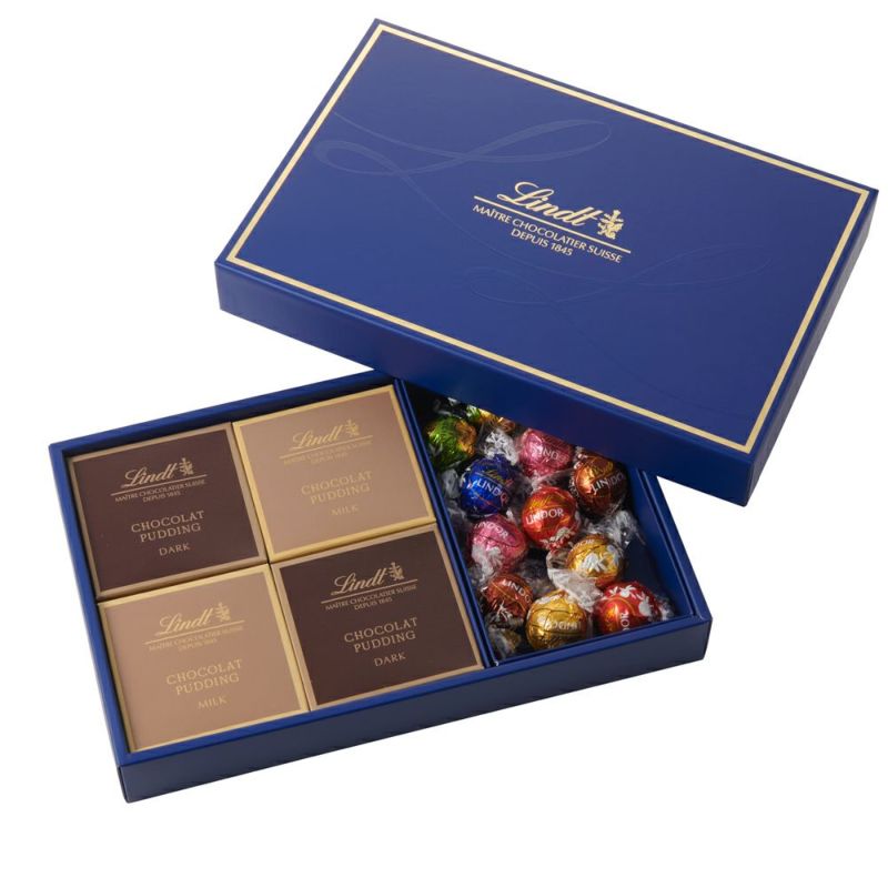 鮮やかなロイヤルブルーと、箔押しされたスペシャルなパッケージはいろんな贈り物におすすめです。濃厚なカカオ感と、クリーミーでなめらかなくちどけを楽しめる贅沢な味わいのショコラプリンと、リンツの看板商品リンドールを贅沢に詰めたボックスとなっています。