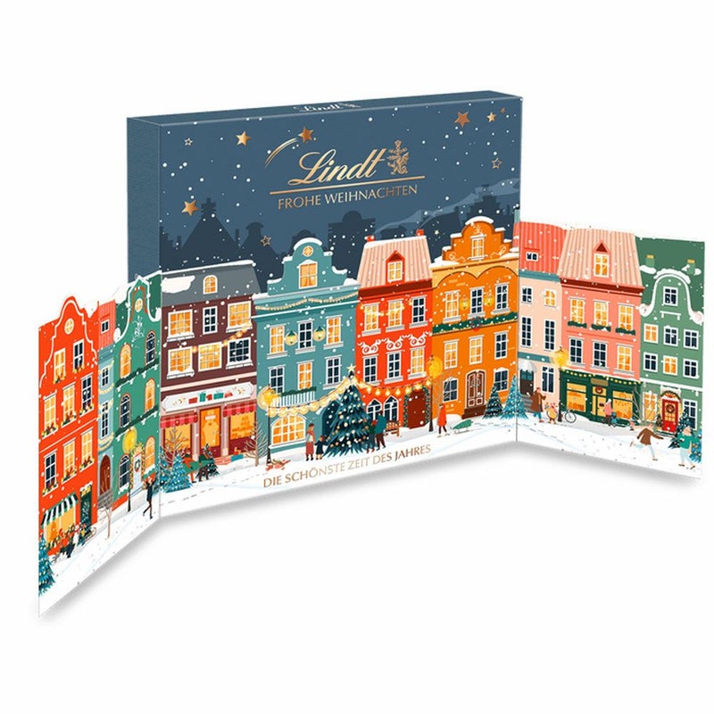飾るだけでお部屋が華やかになる見開きタイプ。心温まるクリスマスの街並みが描かれています。大人気のリンドールや、サンタやミニテディの入った子どもから大人まで楽しめるアドベントカレンダー。