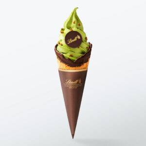 ワッフルコーンの外側トップにはカカオ52%のダークチョコレートをコーティングし、抹茶のほろ苦さとホワイトチョコレートの甘みとのコントラストをお楽しみいただけます。さらに、ロゴ入りチョコレートと追い抹茶をトッピングし、日本とヨーロッパの“おいしい”が融合した逸品に仕上げました。天空の抹茶®とカカオが織りなす、濃厚で奥行きのあるリンツ初の至極のジェラートです。
